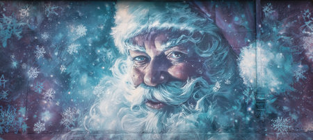 A vibrant mural depicts Santa Claus bursting through a winter scene, surrounded by floating snowflakes. The artwork features magical, surreal elements with cool ambient lighting.