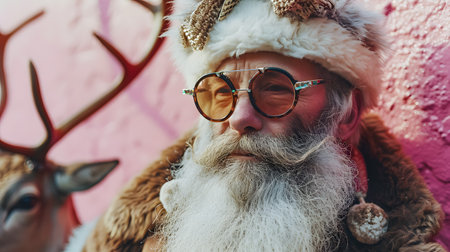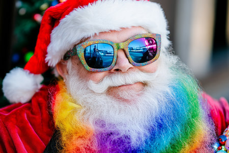 A Santa Claus with a bright rainbow beard, wearing a funky multicolored suit and sunglasses.
