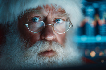 Santa studies data on a computer, showing a mix of curiosity and concentration. The warm glow of the screen highlights his thoughtful expression amidst holiday decorations.