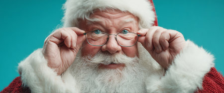 A joyful Santa Claus wearing a festive red suit, a fluffy white beard, and glasses is smiling warmly. The bright blue background enhances the cheerful holiday spirit and mood.