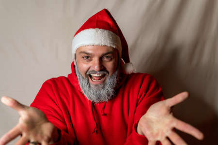 Santa Claus stands in front of the camera with his arms wide open and invites you to a hug with a big smile