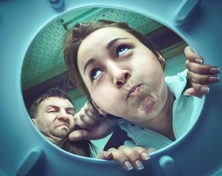 Portrait from inside a washing machine of a young caucasian man screaming