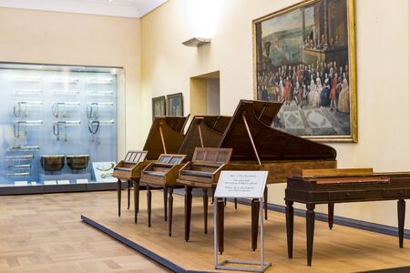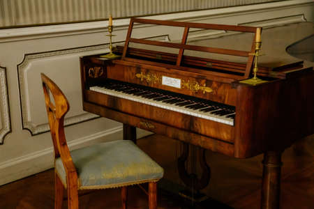 Libochovice, Bohemia, Czech Republic, 19 September 2021: Castle interior with baroque wooden furniture, music salon, antique grand piano, classic Biedermeier green chairs, two gilded candelabra