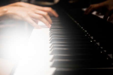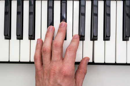 Close-up of the hand of a musical artist playing the piano, a man's hand, classical music, keyboard, synthesizer, pianist.