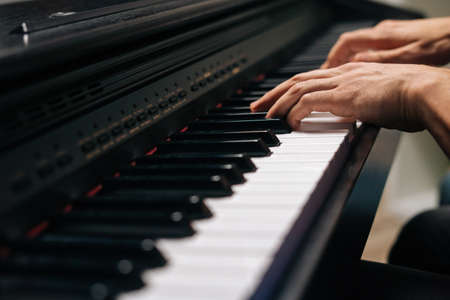 Side view of unrecognizable musician man playing on synthesize at home studio during lesson. Close-up hands of pianist male playing on digital piano in living room. Concept of music education.