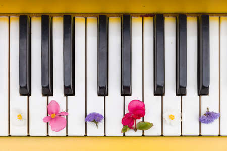 Top view on yellow piano. Closeup of piano keys with nice bright flowers. Music concept