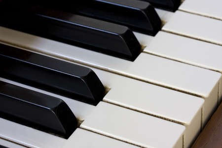 Piano keys on a wooden piano. Close-up. Selective focus.