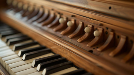 Old wooden piano keys on wooden musical instrument in front view. high quality photo