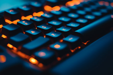 Soft orange light illuminates a sleek keyboard, creating an inviting atmosphere for late-night coding and gaming. The unique key design blends function with style effortlessly.