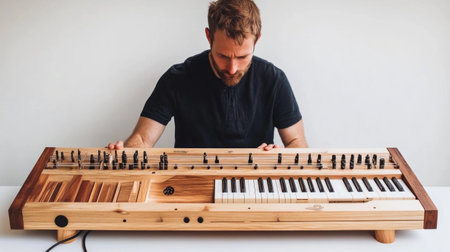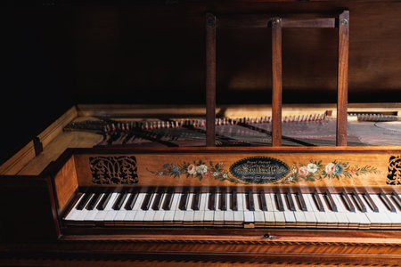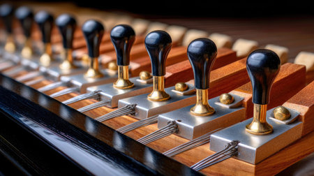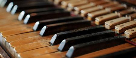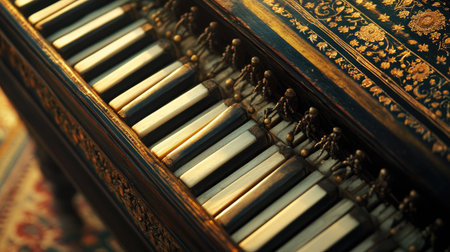 Discover the beauty of an antique wooden musical instrument featuring intricate keys and rich details, all illuminated by warm ambient light, perfect for showcasing historic artistry.