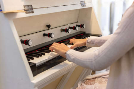 Top view of hand playing piano or elect tone keyboard in vintage color style - Object, Music and Instrument concept