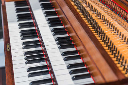 Piano keyboard background with selective focus. Piano, keyboard piano, side view of instrument musical tool. Close-up of a wooden piano set near a window. The most melodious musical instrument