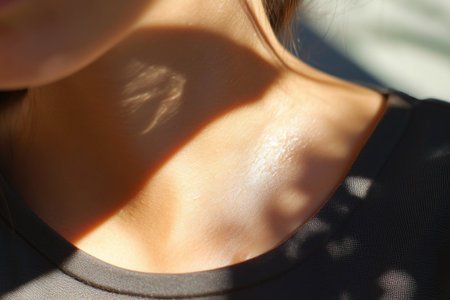 An unrecognizable woman applies a moisturizer to her collarbone. body skin care