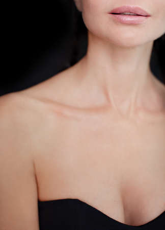 Beauty woman lips nude makeup, beautiful neck and neckline, clean skin on black background