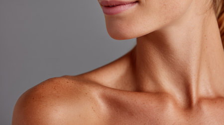 Explore the charming details of a woman's neck and shoulder in this close-up image, showcasing smooth skin and elegant features against a soft backdrop.