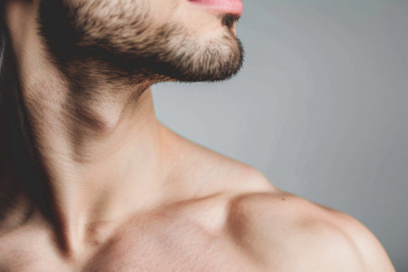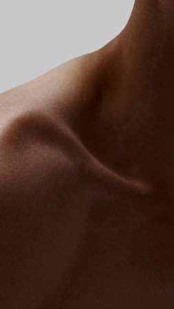Shoulder and neck close up of male body with strong shadows and anatomical contour