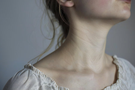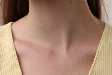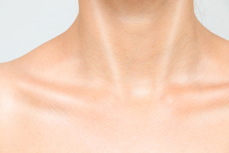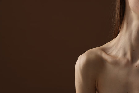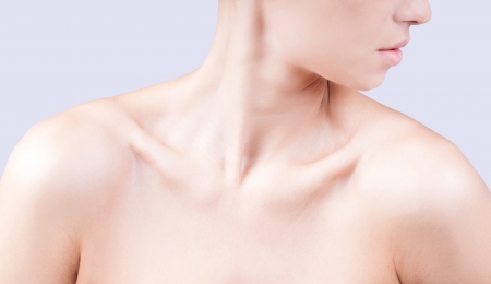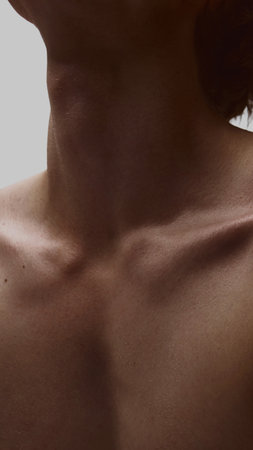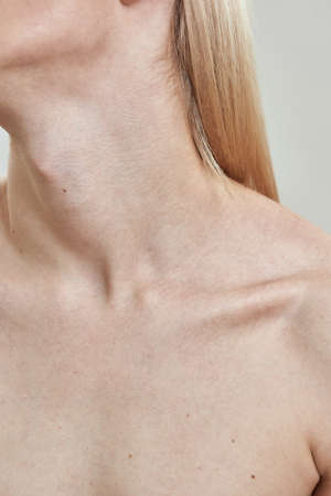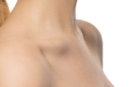 The close-up of a young woman's neck and shoulders in the shadow on white studio background