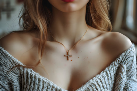 A woman is shown wearing a cross necklace around her neck. The necklace rests prominently on her chest, drawing attention to her faith and beliefs.
