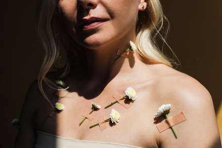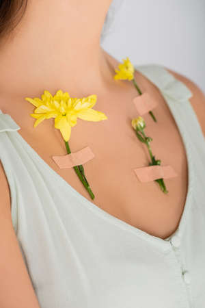 cropped view of plasters with yellow flowers on body of woman isolated on white