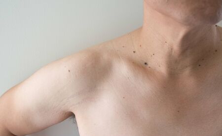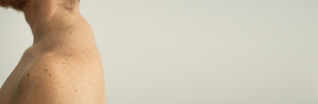 Close up detail of the bare skin on a man back with scattered moles and freckles. Checking benign moles. Sun effect on skin. Birthmarks on skin