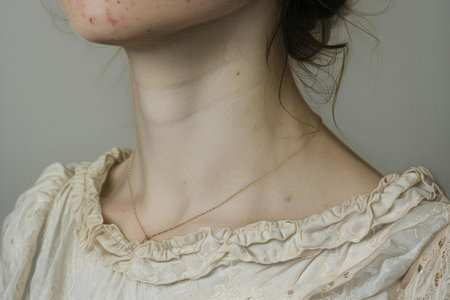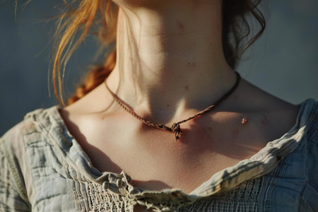 A close-up view of a womans neck area, showcasing a necklace adorning her collarbone. The necklace is intricate and detailed, adding a touch of elegance to the womans outfit.