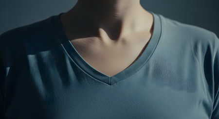 A close-up shot focusing on the neck and collarbone of an individual wearing a plain v-neck t-shirt. The lighting creates subtle shadows and highlights.