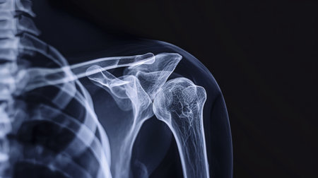 Detailed High-Resolution X-ray Image of Human Shoulder Joint and Rib Cage. Concept of Human Anatomy, Medical Imaging, Bone Structure, Orthopedics, scanning.