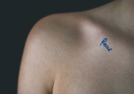 Word fear written on girl's collarbone. Detailed view of pale skin. Blue ink