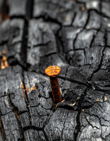A single rusty nail stands resilient, its warm, weathered head a stark contrast against the deep cracks of blackened, charred wood.