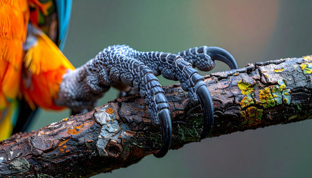 A detailed macro shot captures the immense power in a parrots scaly claws as they grip firmly onto a textured, lichen-covered branch. This image highlights the strength and precision of nature, showcasing the birds secure connection to its wild, arboreal home.