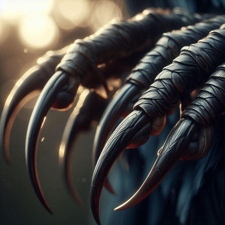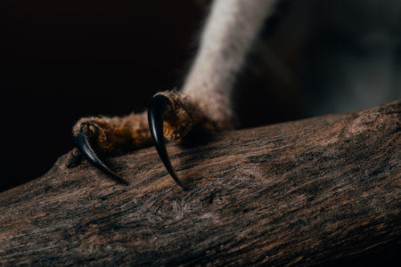 Macro photography of sharp monster claws on blurred empty background. Concept of fear and power.