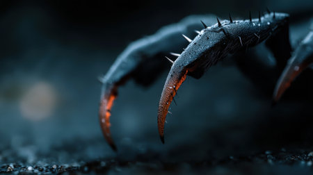 A close up of a spider's claw with red tips. The claw is surrounded by a dark background