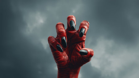 A captivating red hand stretches outward against a moody dark sky, featuring long black nails. This image evokes themes of power, emotion, and artistic expression.