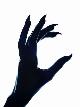 Silhouette of a female hand with stiletto nails on white background.