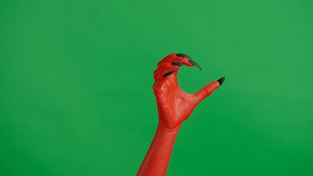Creepy halloween monster hand in red paint with black nails shows crawling catching, isolated on chroma key green screen background, workspace mockup.
