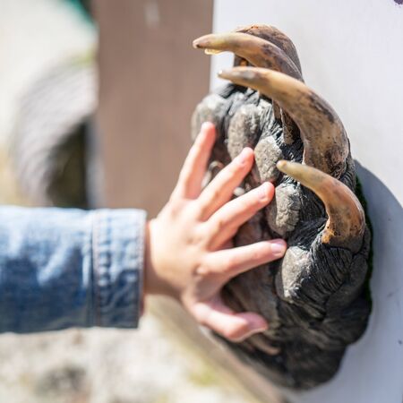 Little girl compares her hand to bear paw. Selected focus