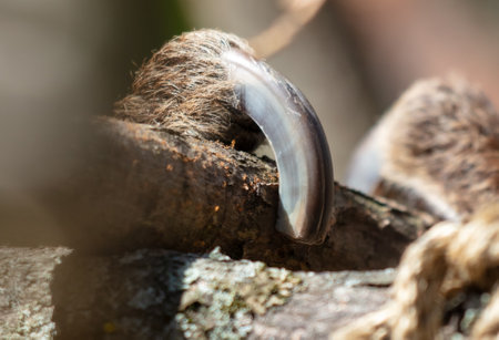 Close-up of a sloth's claws on a tree.