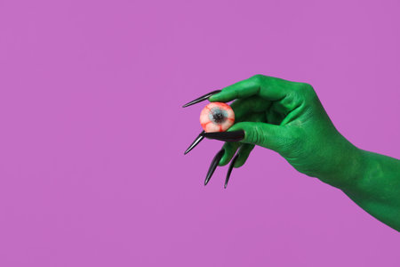 Green hand of witch with eye on purple background. Halloween celebration