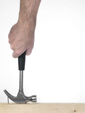 hand of man that hold hammer on the white background during a extration of nail
