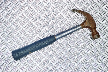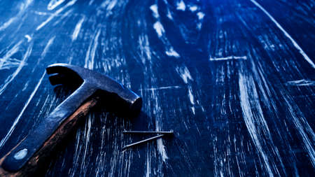 old hammer on a blue wooden background close-up