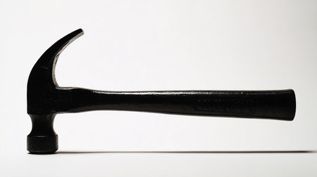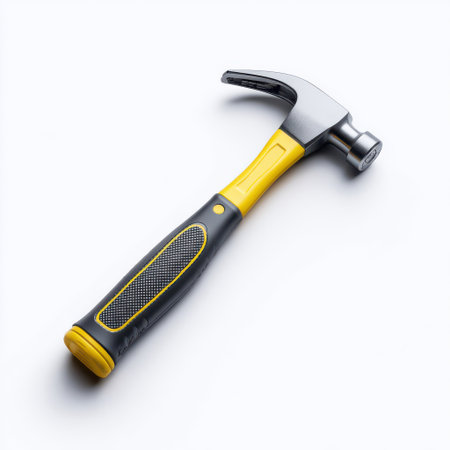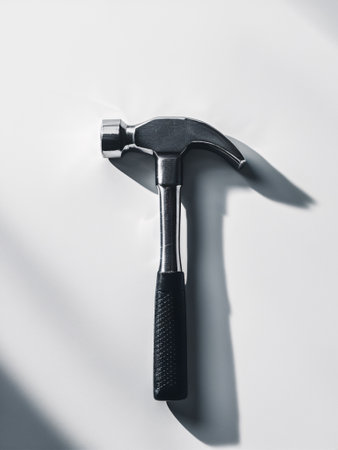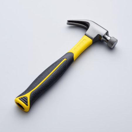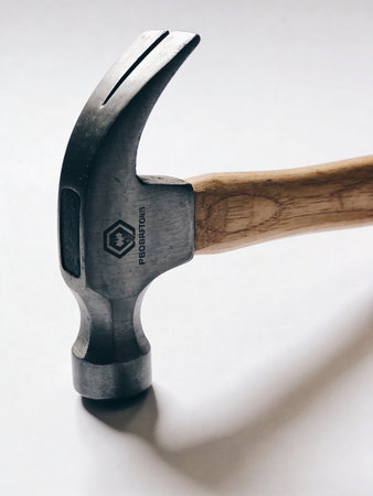 Close-Up of a Modern Claw Hammer with Rubber Grip on a Solid Light Background for DIY, Home Improvement, and Construction Projects