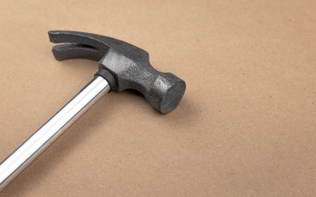 Iron hammer isolated on a table with a textured brown paper background.
