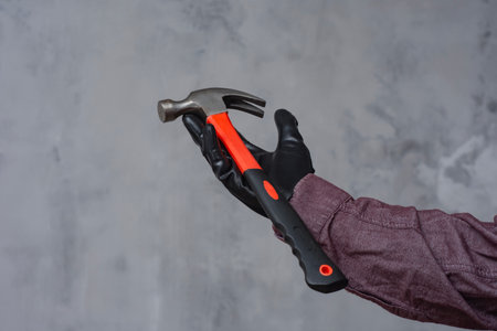 Hand in black protective glove holds hammer with red handle against gray concrete wall. Concept of manual labor, construction works, DIY and repair works