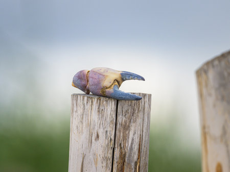 A crab claw lies on a wooden post in Pennedepie, France, summer season, abstract composition showing natural and marine detail.