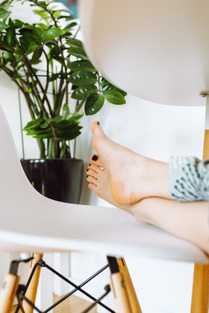 bare feet young woman lying on chair, next to flowerpot