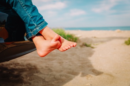 feet of little girl travel by car on beach