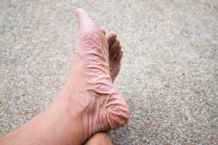 The feet and toes of elderly people have dry, wrinkled skin.