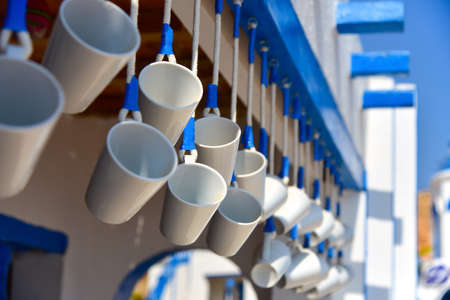 White mugs hang in a greek street cafe.