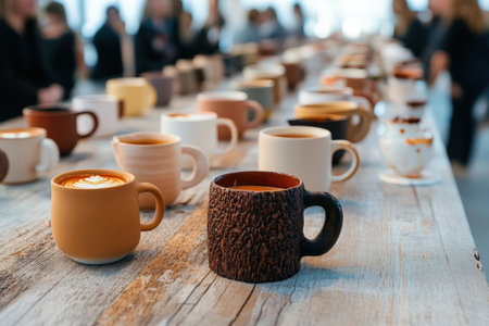 Colorful coffee cups arranged neatly on a wooden table in a cozy cafe during the morning, creating an inviting atmosphere for coffee lovers and visitors