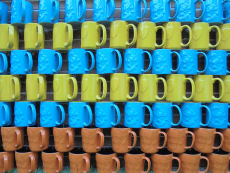 A lot of multi-colored pottery background. Hobbies or traditional handicrafts.